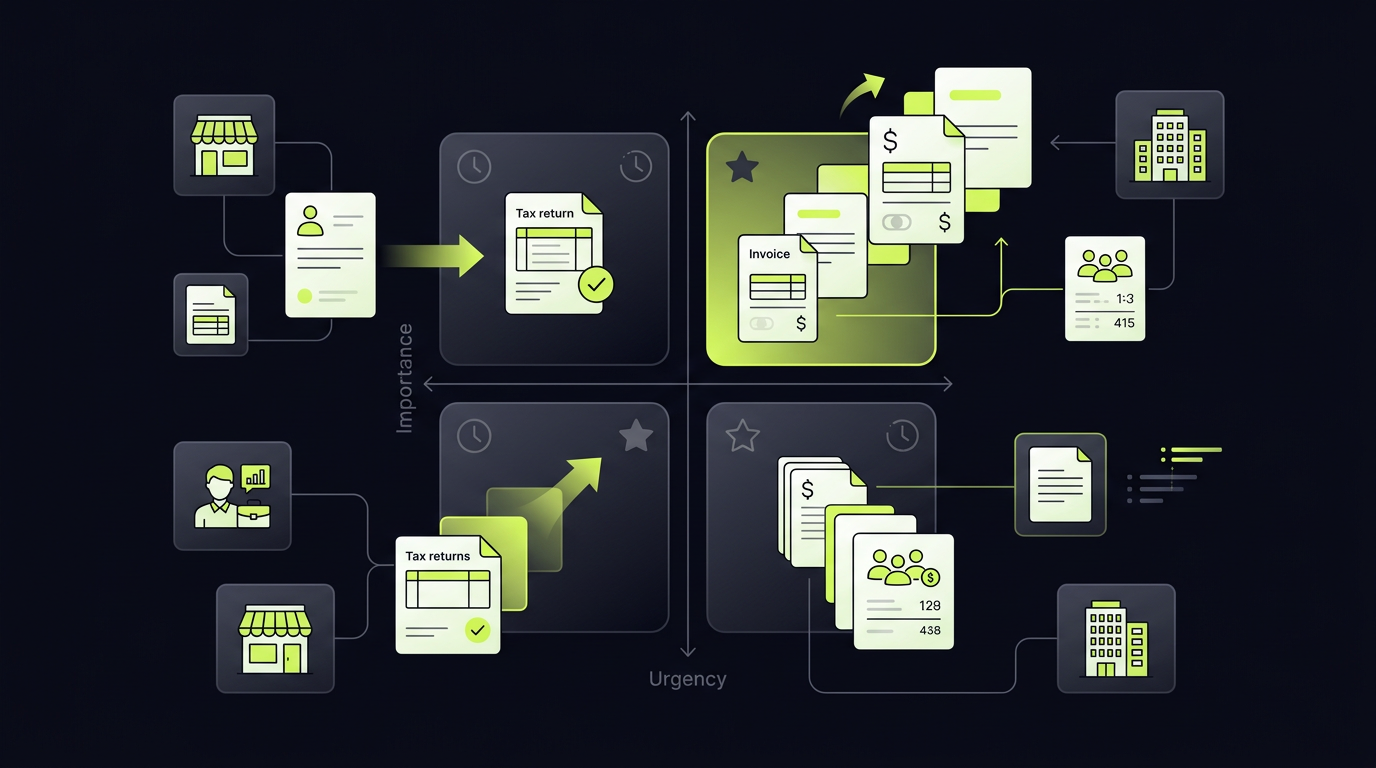 Когда клиентов больше 10, мозг начинает приоритизировать по громкости, а не по риску. Кто громче написал в мессенджер - тот и в очереди первый. В итоге к 26 апреля выясняется, что тихий клиент на ОСНО с НДС и налогом на прибыль сидит в самом конце очереди, а ты весь день разбирался с упрощенцем без сотрудников.